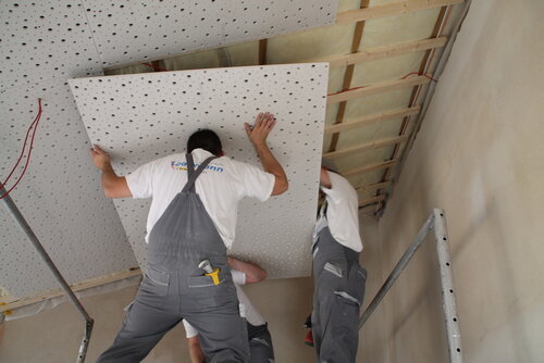 Neben den dämmenden Vorteilen wirkt die Lochplattendecke optisch schöner als eine vergleichbare geschlossene Gipsplattendecke.